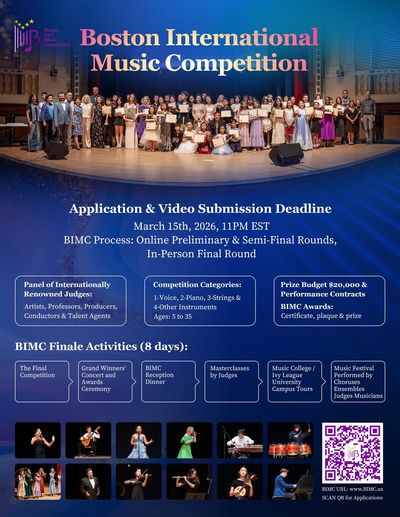 - 7/19/2026 Sunday 2PM-5PM EST, Cary Hall, Lexington MA - BIMC Winners' Concert & Awards Ceremony, free to contestants. Open to Public.